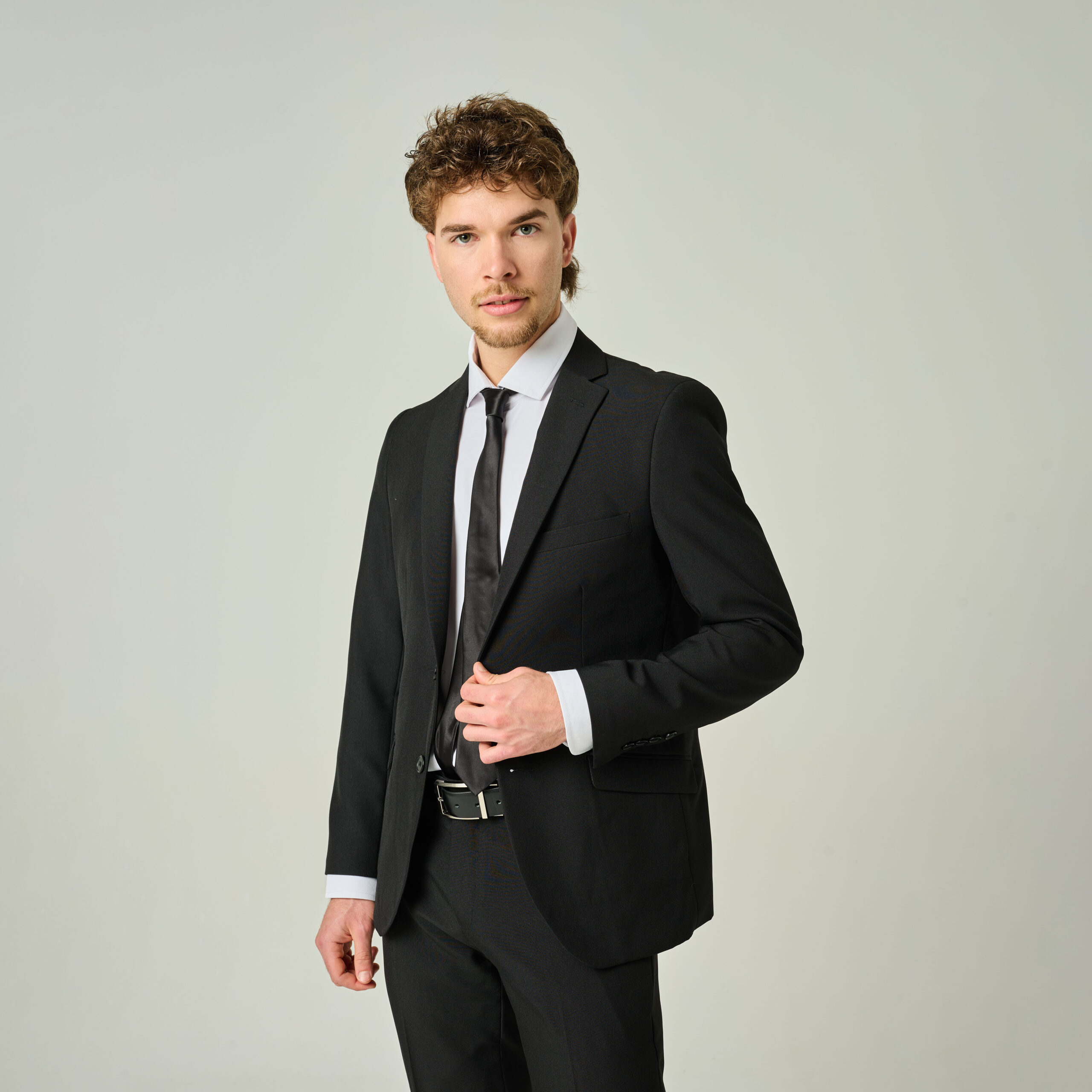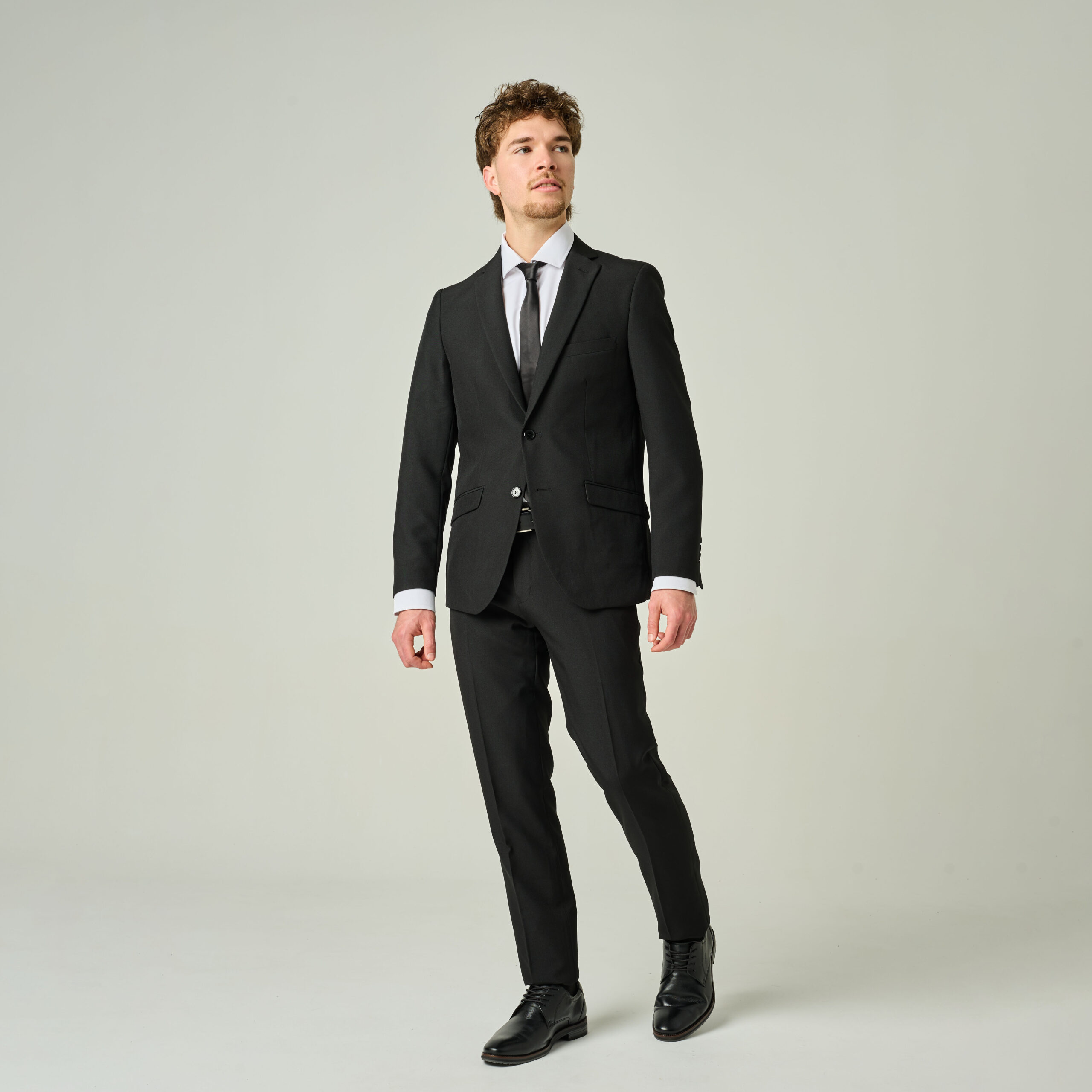 Conjunto ambo (chaqueta y pantalón) en tela Panamá color negro.