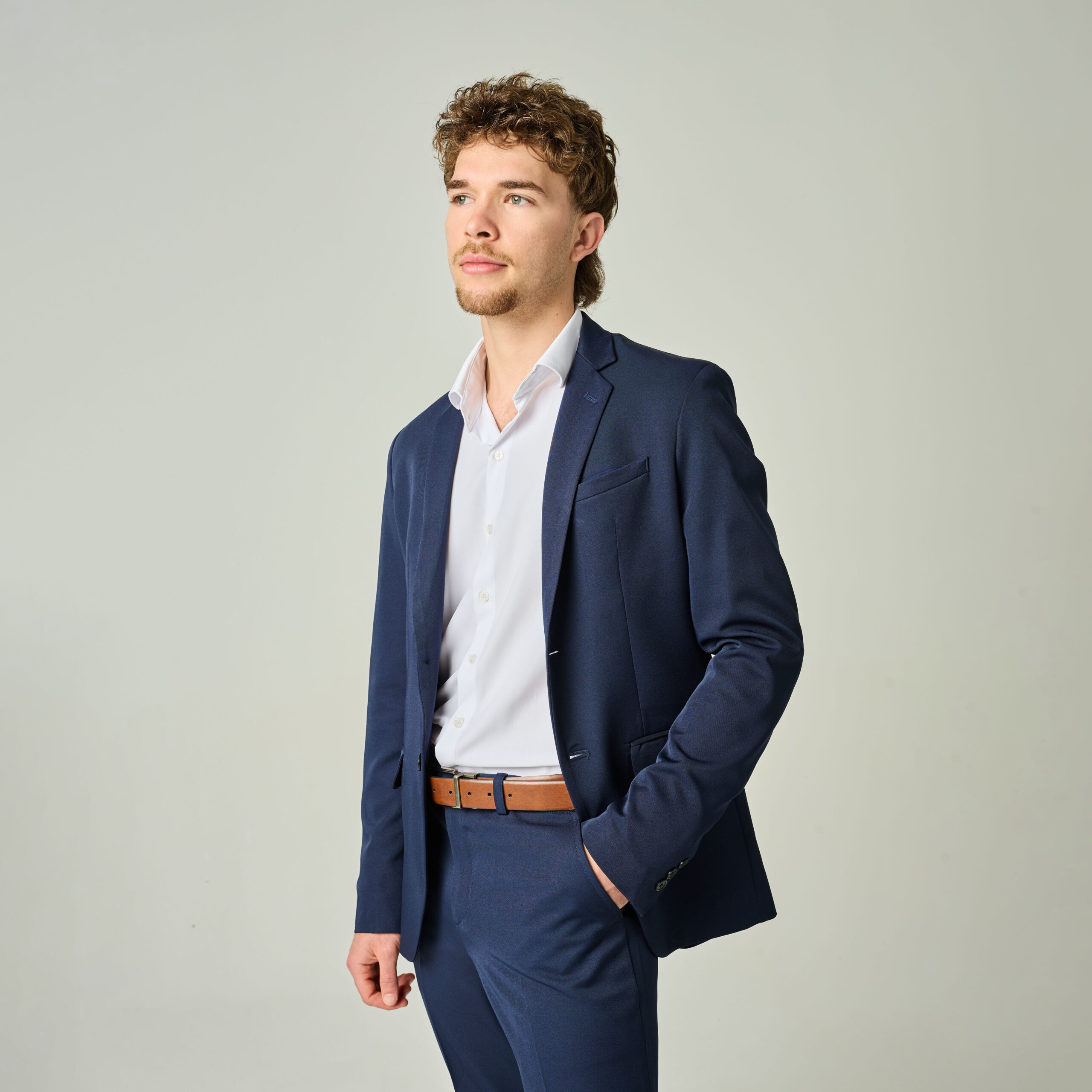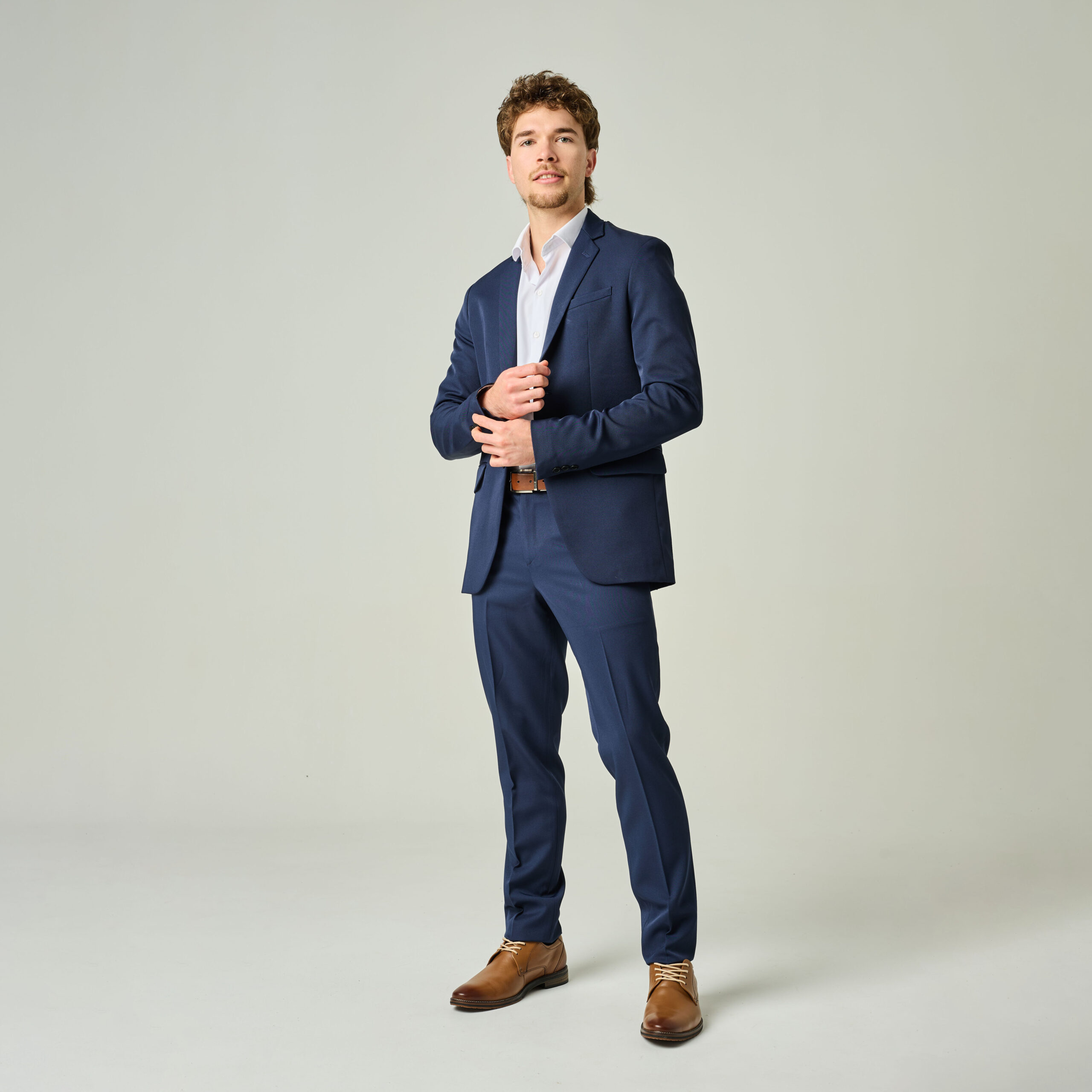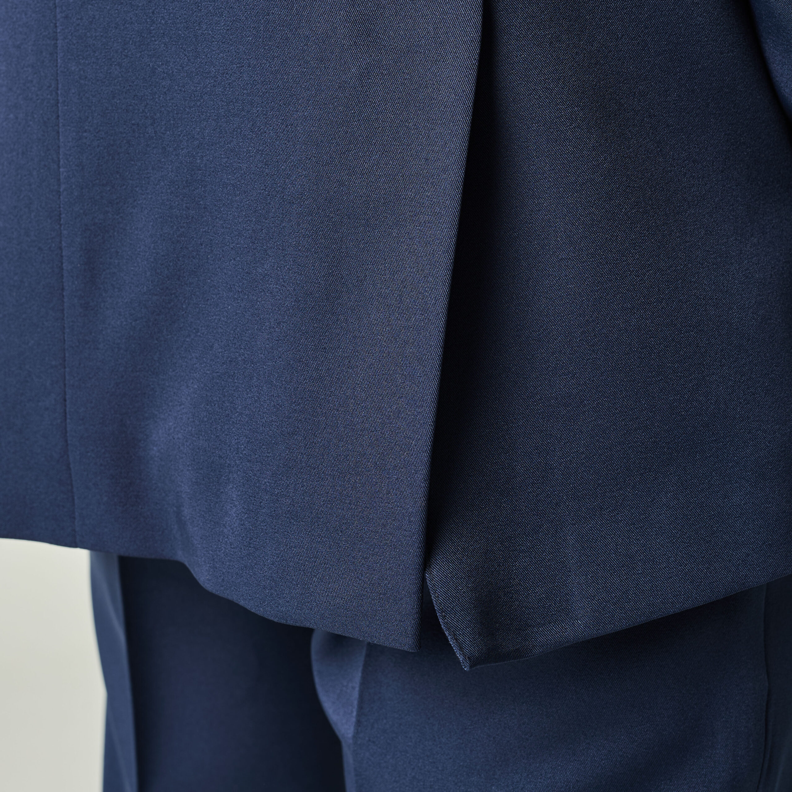 Conjunto ambo (chaqueta y pantalón) de tela de Lycra. Color azul.