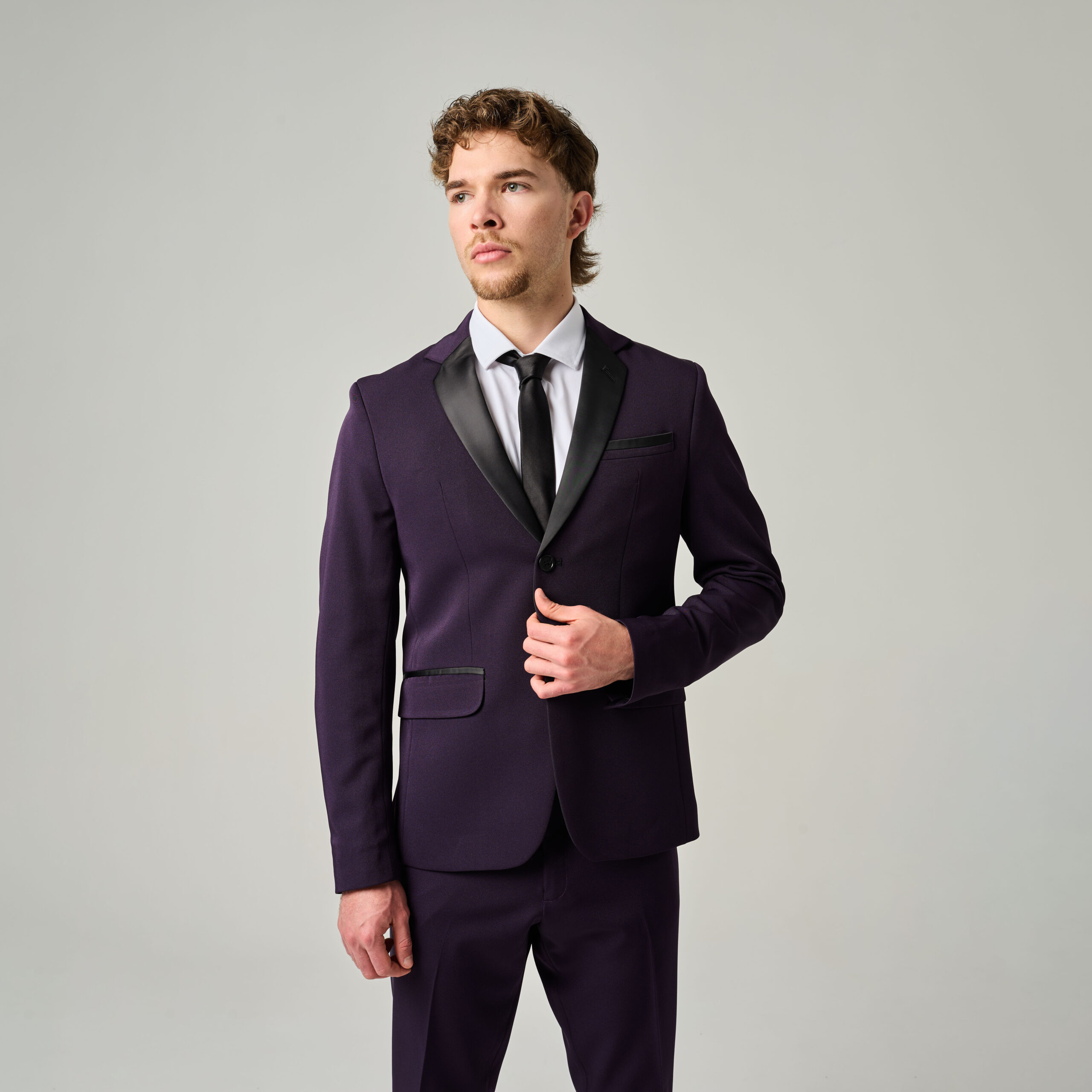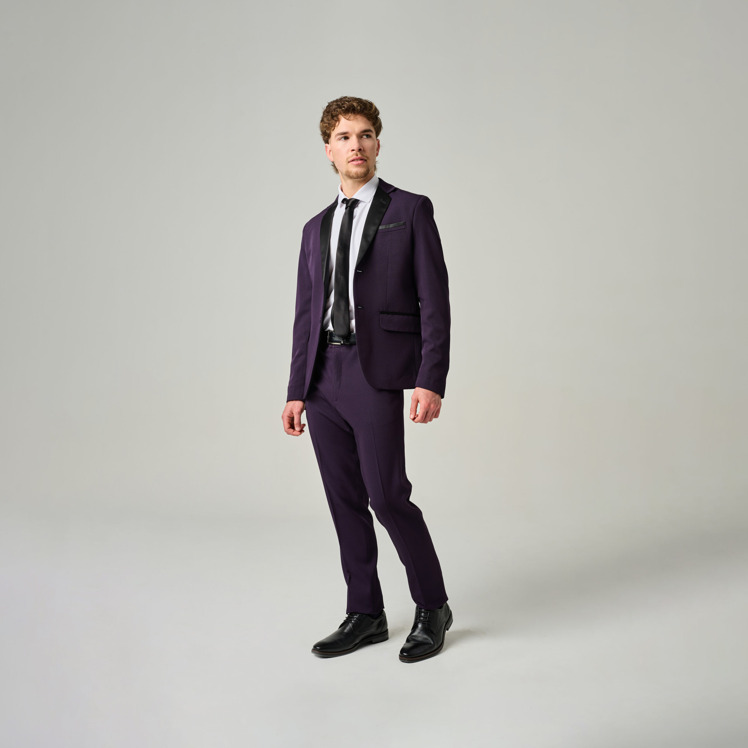 Conjunto ambo (chaqueta y pantalón) violeta. Tela Lycra y raso en detalles.